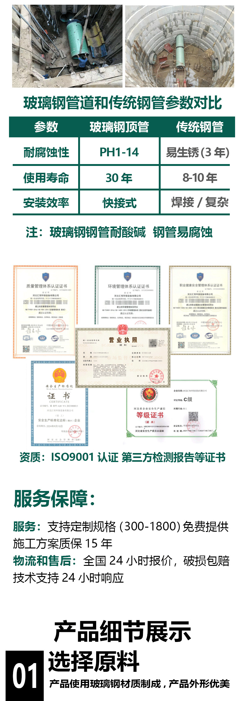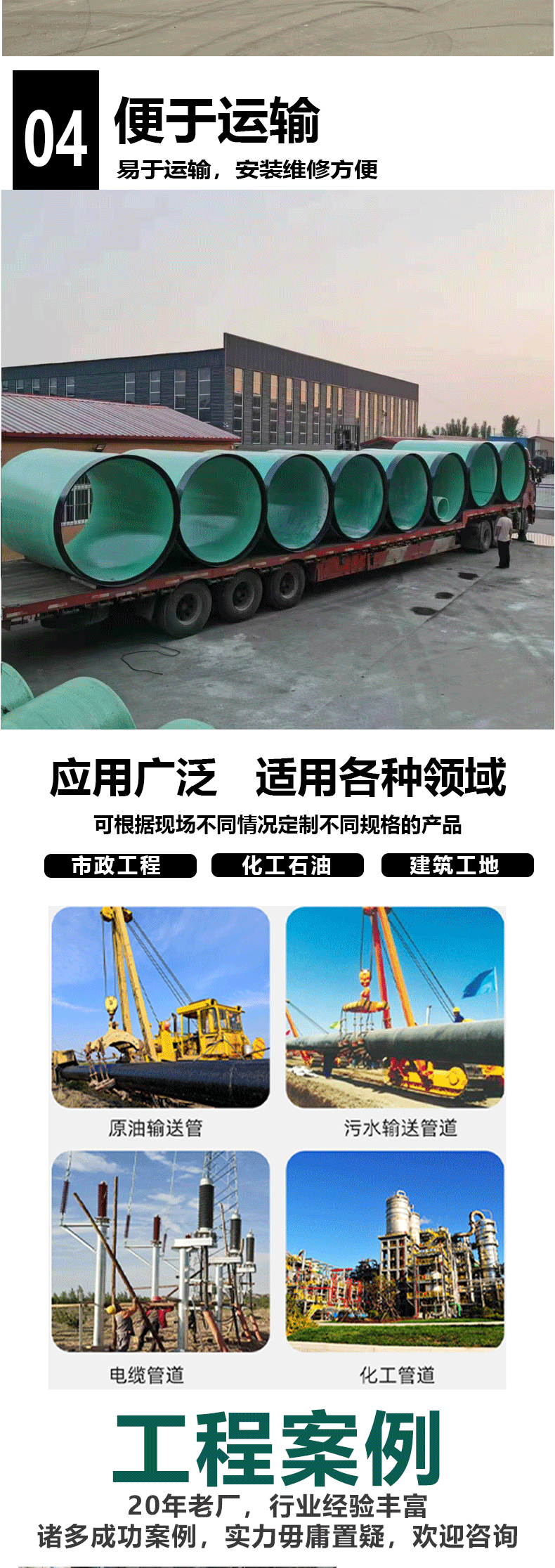 特点:施工快、运输便捷,采用玻璃钢材质,耐腐蚀、强度高,适用于各类市政、工业管道工程。