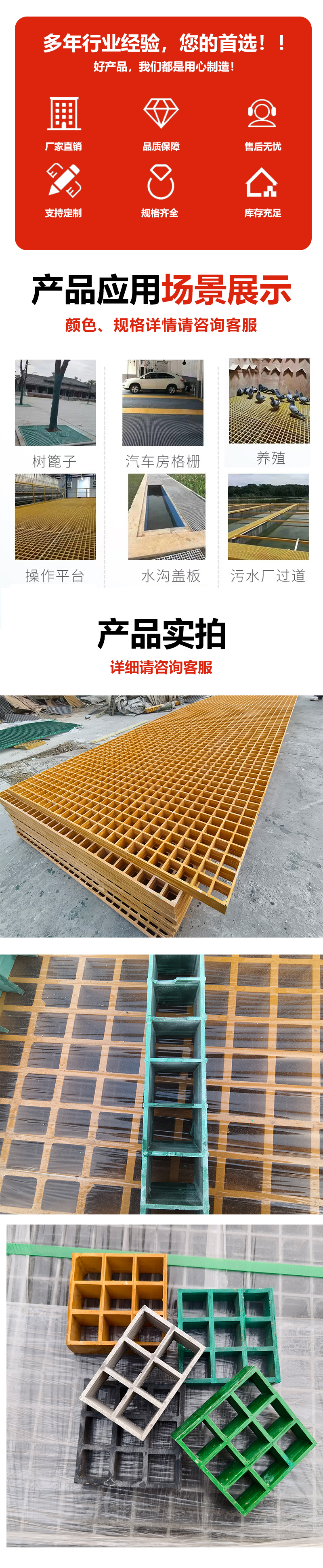 应用:化工、市政、污水处理、仓储、电力等行业,用作走道、平台、沟盖、井盖等,适配防滑承重、安全防护与耐腐蚀场景需求。